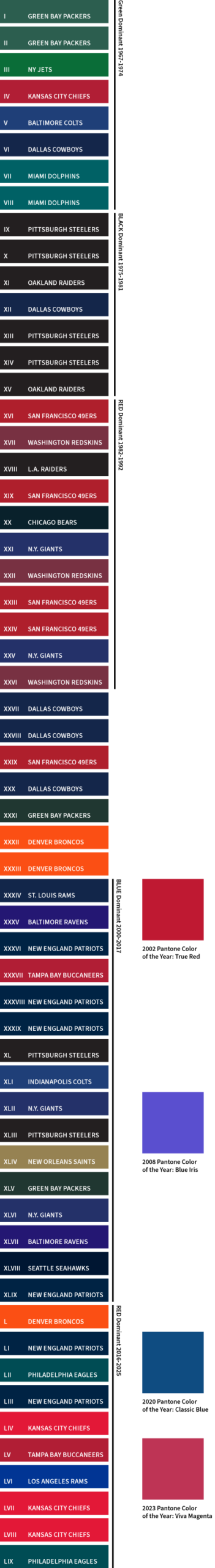 You can tell a lot about a sports fan by the clothes they wear — the passion, the energy and the expense to blend in or stand out with their tribe. We wondered if championship teams and their fans have anything in common on the color wheel. Never looked at it until now, and sure enough there’s some interesting similarities. This is not a scientific study, but a simple observation about championship teams, specifically Super Bowl winners.